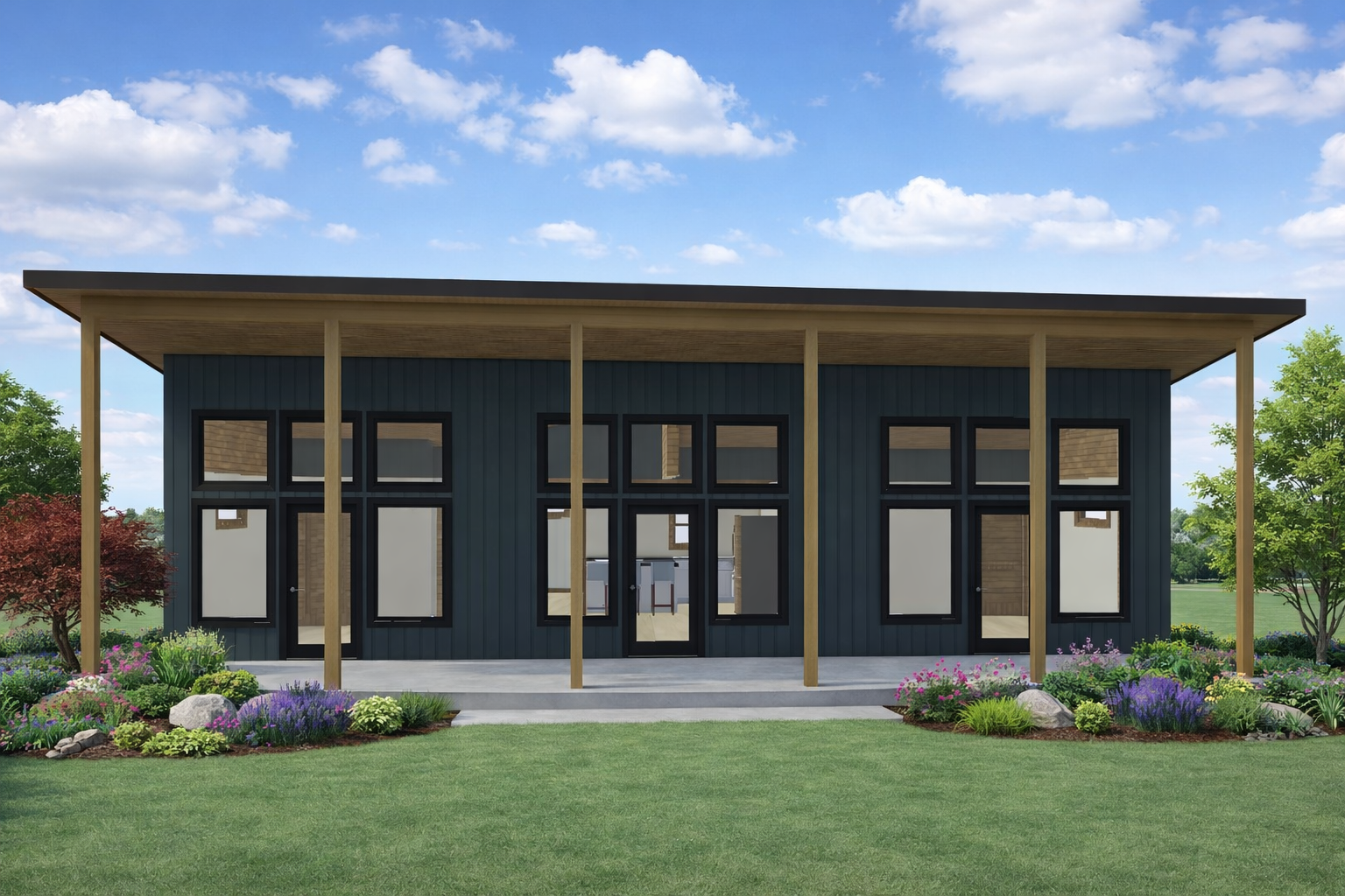 This 1,299 sq ft modern floorplan blends clean architectural lines with warm, natural elements for a striking yet inviting presence. The single-level layout features a spacious open-concept living and kitchen area at the heart of the home, flanked by a private primary suite and a comfortable guest bedroom. Functional spaces like a dedicated mudroom, laundry area, and ample storage add everyday convenience, while expansive rear windows and a covered patio create a seamless connection to outdoor living. With its sloped rooflines, modern exterior finishes, and efficient footprint, this plan offers stylish simplicity perfect for a mountain retreat or contemporary primary residence.